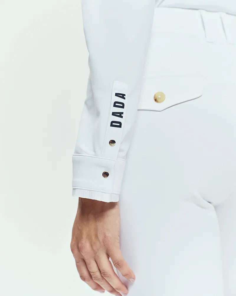 - Discreet closure: invisible buttons on the front with gold snaps on the cuffs.
