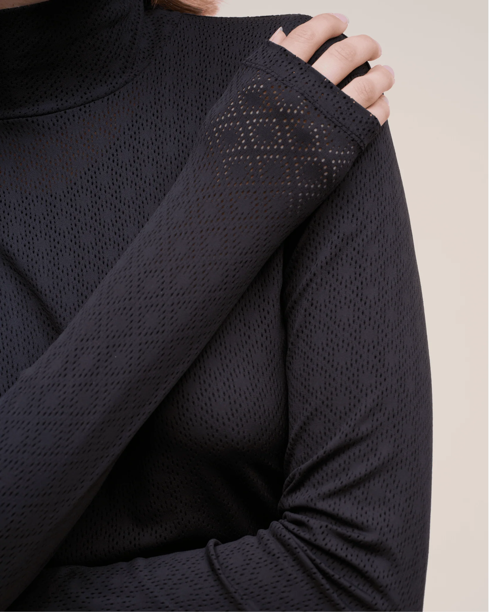 - Tissu en jacquard avec motif “small tiles”, évoquant une mosaïque grâce à une technique spécifique de tricotage de la fibre stretch.