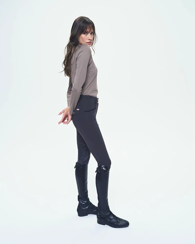 T-shirt technique d'équitation à manches longues, conçu pour les cavalières en quête de performance. Son tissu italien micro-perforé et éco-responsable offre une respirabilité exceptionnelle, une protection UV UPF 50+ et un confort absolu en mouvement. Sa coupe cintrée, son col rond et son design épuré allient élégance et technicité pour vous accompagner dans chaque entraînement.