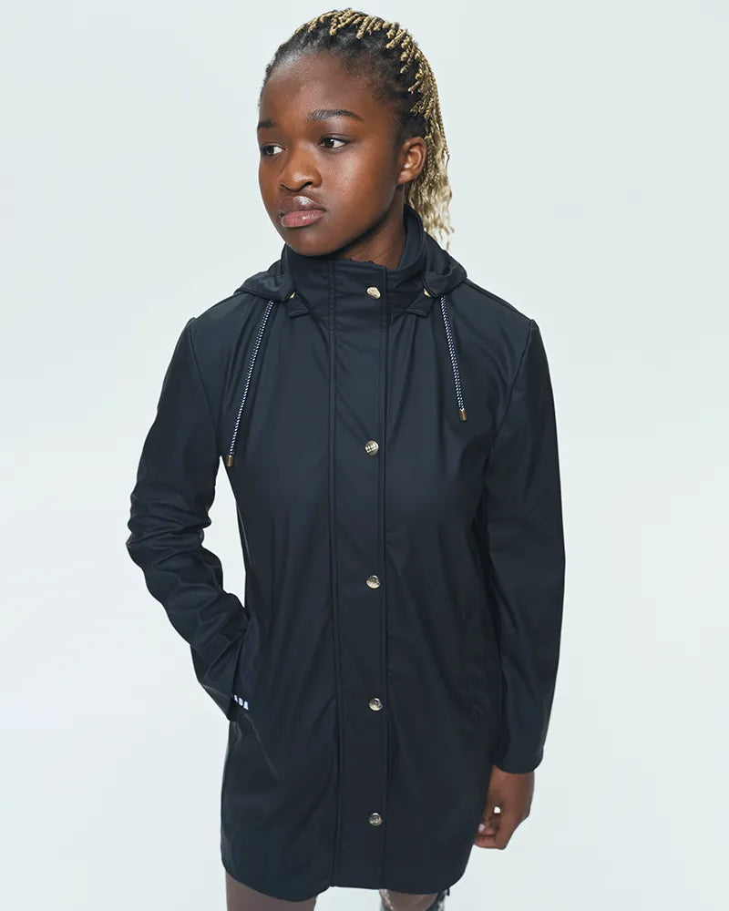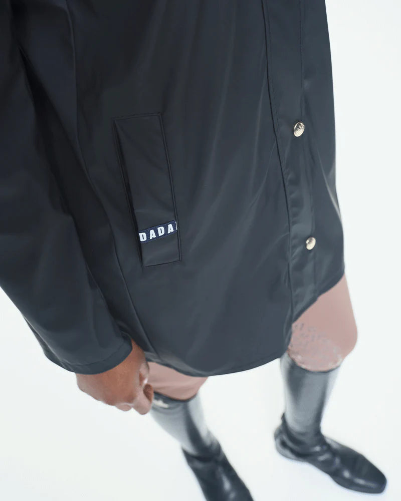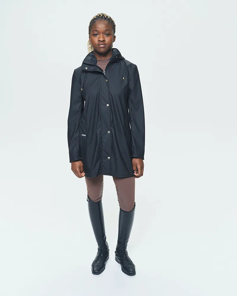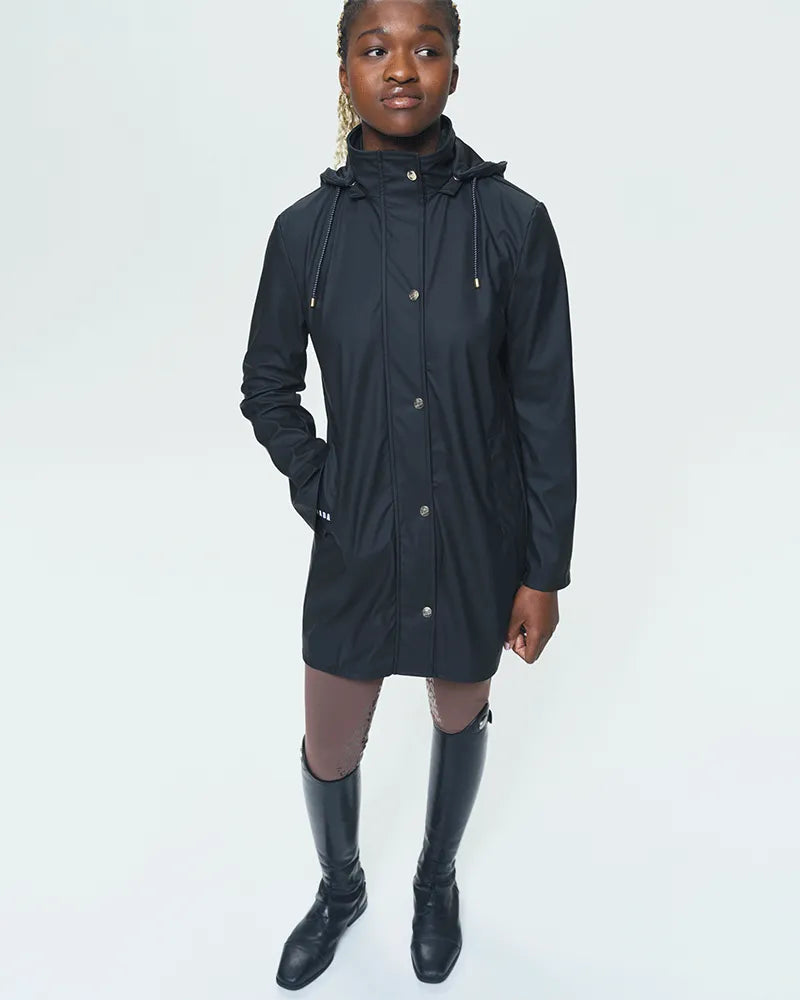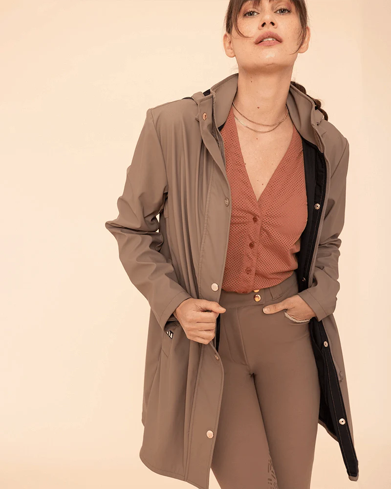Manteau de pluie pour l'équitation alliant élégance et praticité. Coupe ajustée, capuche amovible et tissu imperméable: parfait pour affronter les jours de pluie.