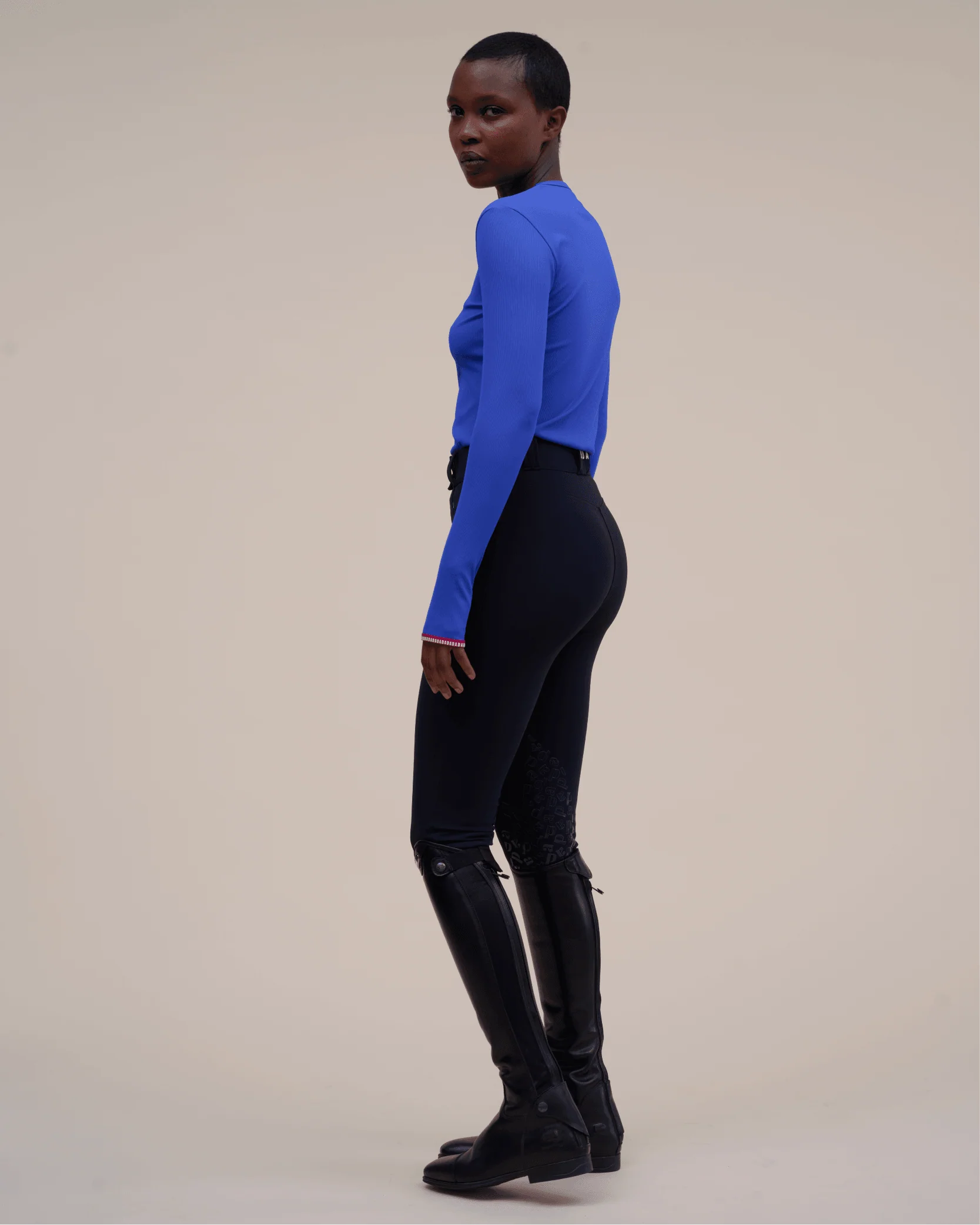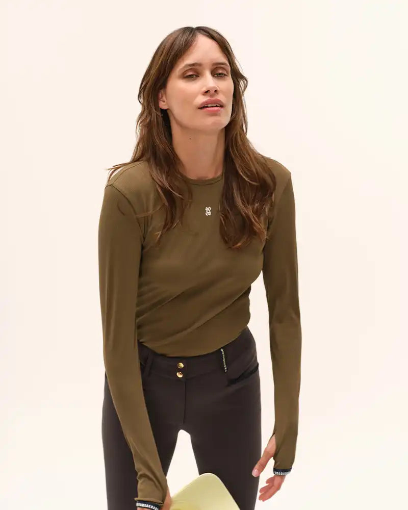 T-shirt technique d'équitation à manches longues – Respirant, côtelé et ultra-confortable grâce à sa coupe ajustée et ses passe-pouces pratiques. Parfait pour les cavalières en quête de performance et d'élégance