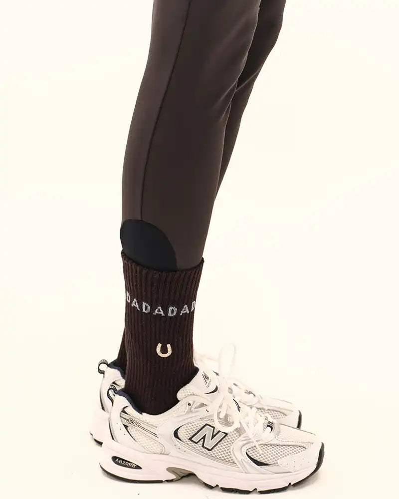 - Design Dada : logo DADA en jacquard sur le haut de la tige, broderie fine à la cheville inspirée de l’univers équestre.