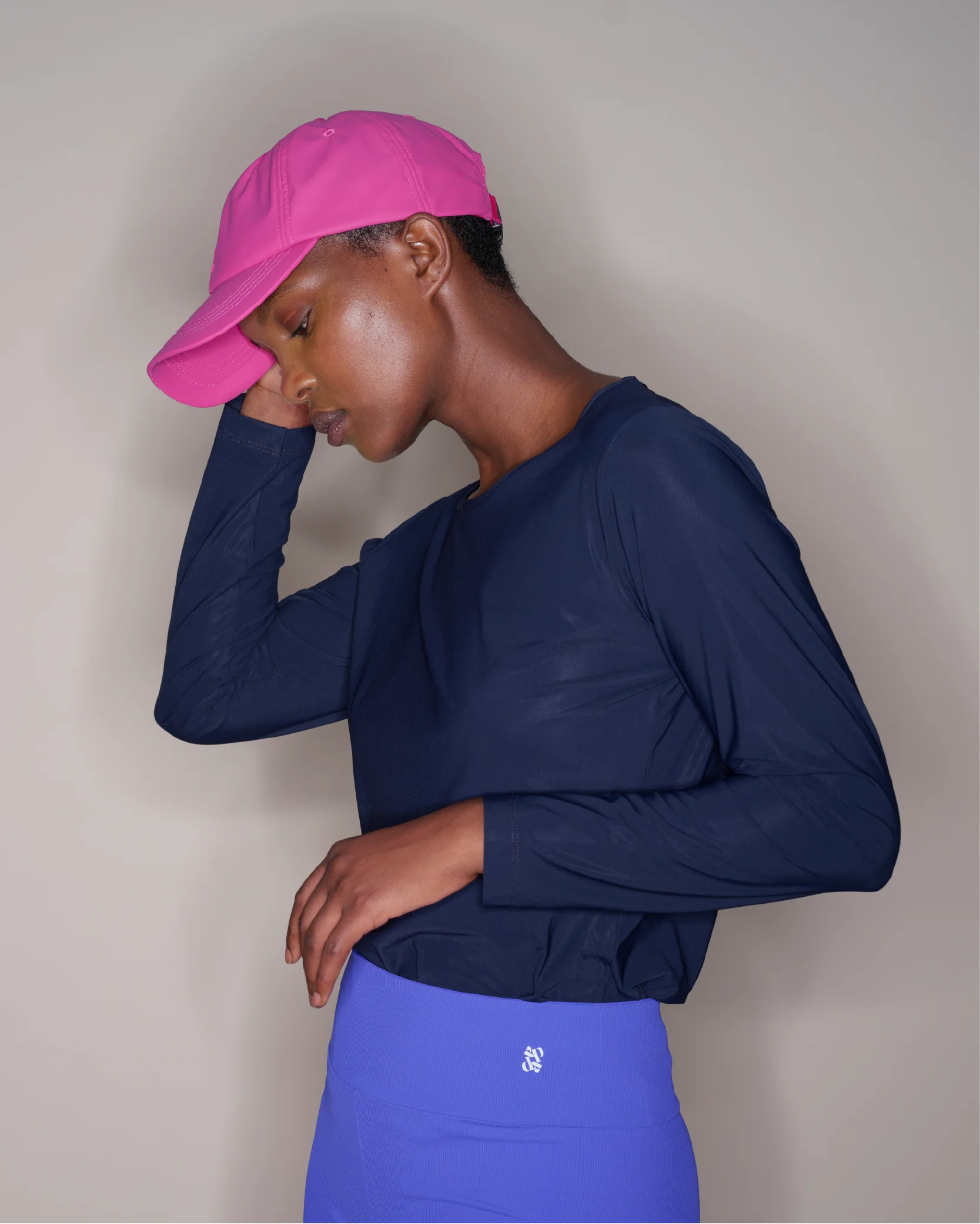 Scarlett est la casquette en toile imperméable avec logo double monogramme en silicone ton sur ton sur le devant.