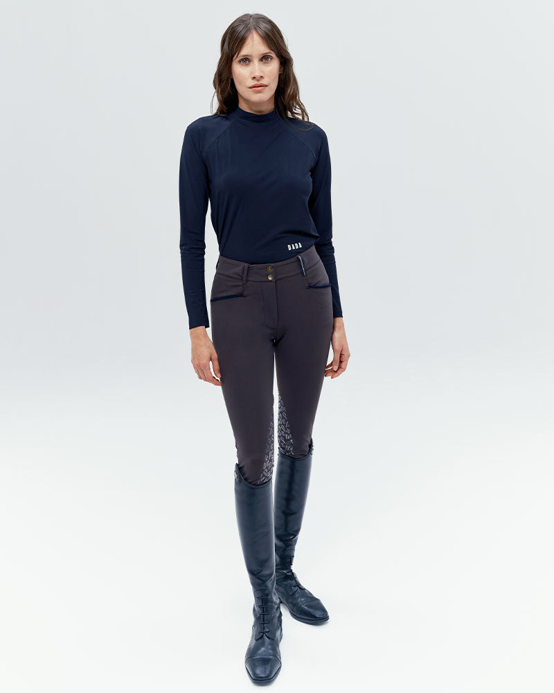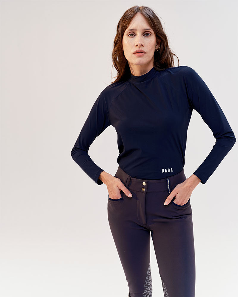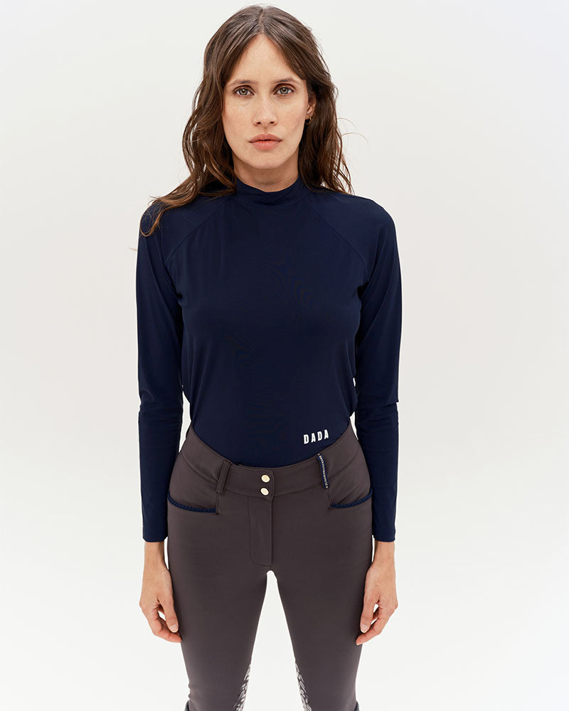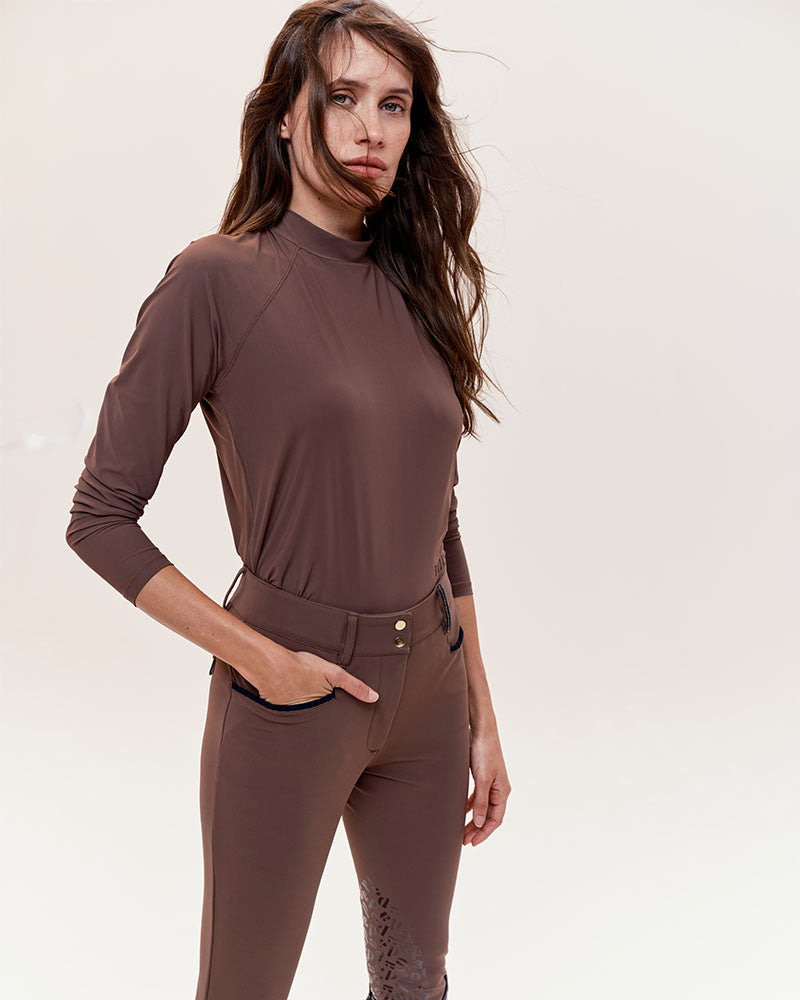 T-shirt technique léger d'équitation à manches longues, conçu pour les cavalières recherchant confort et performance. Avec son tissu italien ultra respirant, léger et protégeant des rayons UV, il offre une coupe cintrée et un col montant idéal pour l’équitation. Disponible en café, noir et marine, ce modèle allie élégance et praticité grâce à son entretien facile.